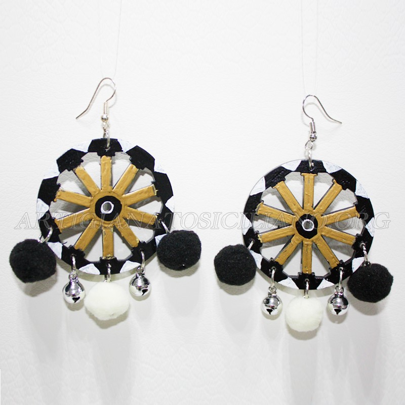 Orecchini in fibra di legno, dipinti a mano con pompon e campanellini